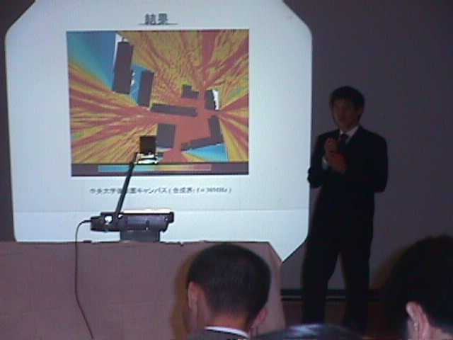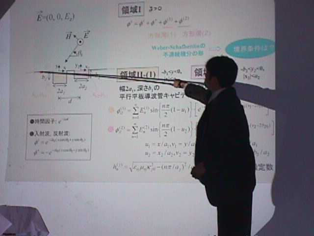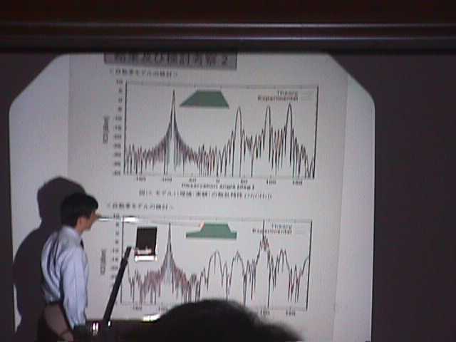 11月8日から3日間北海道登別で開催された電磁会理論研究会に橋口君と若柳君が発表を行ないました.天候や気候にも恵まれ,紅葉のなか北海道の大自然を大いに堪能してきました.(私達が帰った次の週には,北海道では大雪に見舞われたそうです.)今回,橋口君は始めての学会発表なのにもかかわらず, OHPが完成したのは出発日の前日,もちろん通しの発表練習はほんの数回程度,白井先生もほとんどノータッチといった状況でした.若柳君の方は学会発表5回目ということもあり余裕がひしひしと伝わってきました.お互い「向こうで練習しよう」と話合っていました.ところがホテルに着くや否や食事やら買出しやらでどたばたしていて,さらに相部屋だった東北大の佐藤先生のペースに巻きこまれ,ついビールを...いつのまにか気分はハイテンションに.そのころには発表のことなんかこれっぽちも覚えていないような有様でした.発表当日の朝,何やらお経のような声で目を覚ましました.気がつくと隣には橋口君が呪文を唱えるように発表原稿を繰り返しているではありませんか.往生欺が悪いと言おうか,あきらめが悪いと言おうか,一方,発表練習をしていない若柳君の方は対称的にあきらめが早いと言おうか変に度胸があると言おうか,「もうここまできたらどうにかなるさ」というような感じでした.いざ,大勢を前にして,まず白井研トップバッターの橋口君が壇上に登場しました.「・・・と題しまして中央大学の橋口が発表させていただきます.」ここまではいい調子だぞ.ところが次のOHPをめくった途端,まるでインディー500のロケットスタートをまたは,「セーラ服と機関銃」に出てくる薬師丸ひろ子の銃の乱射シーンを連想させるようなマシンガンスピーチが始まってしまいました.「誰か暴走する彼を止めてくれ!そんなに早口では発表時間が大いに余ってしまう〜」と私は心の中で叫んでいました.すると,不慣れな発表を気使ってくれたのか,はたまた,ただ本当にそう思っただけなのか,発表中にある先生が「OHPが見えません」と彼に救いの手を差しのべるではありませんか.しかし,こんな事くらいでは暴走列車は止まりません.そのまま一気にゴールしてしましました.質疑応答はあまり少ないため無理やり東工大の安藤先生や我が白井先生が質問するといった割と穏やかな印象を受けた電磁会理論研究会,ところがこのときばかりは違いました.数名の手が挙がるような非常に反響の大きいすばらしい発表内容でした.発表時間は余っていた分,逆に質疑応答時間は足りないほどでした.また,橋口君の二人後には若柳君の発表です.練習はほとんどしていないようでしたが流石に慣れた様子.堂々とした態度でした.発表時間ぴったりで終える当たりさすがベテランと言った感じでしょうか.こちらの方も内容が簡単なためでしょうか?または,一般の方にもとっつきやすいテーマのためでしょうか?彼の質疑応答も橋口君に次ぐくらい活気あるものでした.「白井研は非常に面白いテーマを行なう」と他の先生方からも大変好評でした.学会を盛り上げることができ白井研の一員としては大変満足していますが,登別には温泉しかなくほとんどホテルに缶詰状態だったため旅行としてはいまいちでした.(でも,温泉好きの白井先生は白濁の湯に終止ご機嫌でした.)